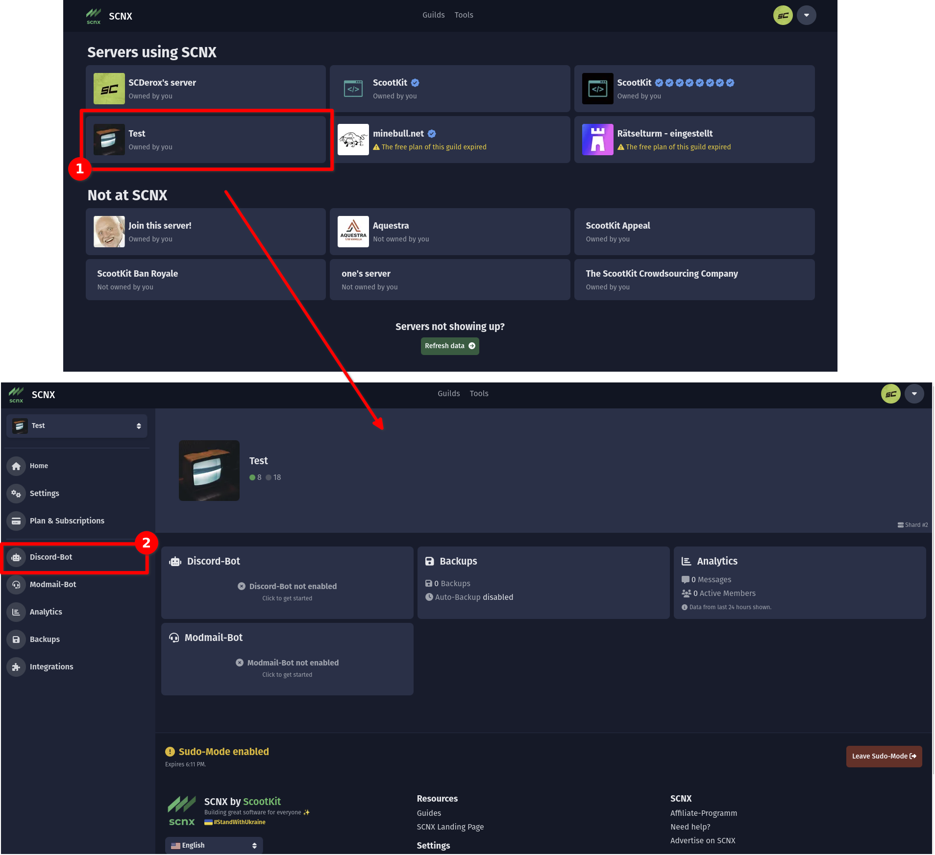Open the SCNX Dashboard and select the server you want to create the bot for. Next, select "Discord-Bot" in the sidebar.